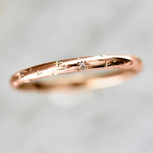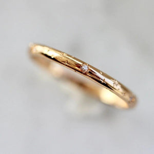 This Mid-Century inspired ring is the thinnest in our Celeste trio which features star engravings, diamond accents, and a rounded gold band. Swift and careful hand movements create this motif with precise detail and extraordinary celestial ring design in your choice of golds. All star rings are hand engraved locally in San Francisco, CA. Learn about all of our Celeste iterations in this blog post.