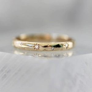 A lab diamond version of our all-time best seller and total crowd favorite, this Mid-Century inspired stunner is the middle width in our iconic Celeste trio. Star engravings dance across the band, punctuated by twinkling lab-grown diamond accents and wrapped in a softly rounded gold band. Every celestial detail is hand-engraved with care and precision, creating a ring that truly shines from every angle.