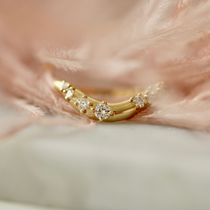 An understated curve with serious gravitational pull. Orbit wraps your finger in a soft arc in your choice of gold, scattered with high quality round cut natural diamonds - like tiny satellites caught mid-spin. Each stone is placed with just enough asymmetry to feel effortless, and plays well with others but stands strong on its own. Whether you're stacking or solo styling, Orbit will always finds its center.