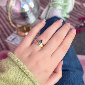 Hot Streak features a 1.36 carat blue kite cut sapphire that is as vivid as it is stunning. The swirling blue hues create almost a tie-dye effect that makes it truly one of a kind with angles that deliver a heart-stopping view. Set in 14k yellow gold, petite claw prongs and fun basket detail.