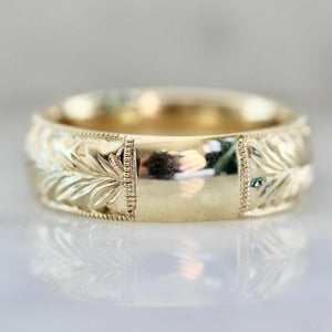 Carved with detail and full of presence, this 14k yellow gold band is 5mm wide and made to shine. Hand engraved laurel leaves wrap gracefully around the front and sides, symbolizing strength, growth, and victory. A smooth sizing bar at the back ensures comfort, practicality, and resizing if needed. Finished with fine milgrain edges for just the right touch of texture. Perfect as a wedding band, stacked for drama, or worn solo, this piece brings craftsmanship and meaning together in a forever-worthy ring.