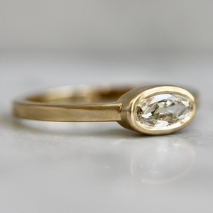 Baby Butter features a mesmerizing lab moval diamond weighing in at .40 carats. Encapsulated in a full slim bezel and an ultra comfortable flat band set in 14k yellow gold. She's sleek, minimal, and the perfect everyday ring. It's ready to serve as the the ultimate self care treat. Limited Edition, there is only one.