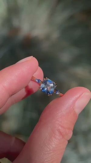 This extravagant take on a classic three stone design features a 1.58 carat blue-white radiant cut bi color sapphire and lovingly offset by a pair of stunningly rich blue kite cut sapphires. Set in 14k yellow gold and held by double claw prongs. You don't get closer to the perfection than this.