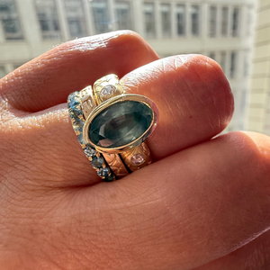 Secret Garden features a truly magnificent 2.08 carat light greenish-teal Montana sapphire in an elongated oval cut as the center stone and secured in a bezel. The substantial band features two white rose cut diamonds amongst a field of florals hand engraved for the most beautiful visual impact. Finished in 18k yellow gold and ready to play with your favorite stackers.