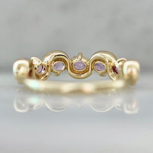 This delectable morsel contains seven generous helpings of the most perfectly pink oval cut sapphires. Waves of gold separate them with pops of prong details. Served in your choice of golds for the perfect treat yourself band.