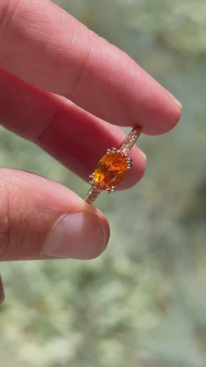 A little slice of sunset for your finger. At the center is a 1.66 carat oval cut spessartite garnet that glows with rich, juicy orange fire. On each side, delicate peach sapphires melt into the warmth, creating a dreamy ombré that feels like dusk on a summer night. Crafted in 14k yellow gold and designed to stack like a dream, she’s equal parts bold and effortlessly wearable.