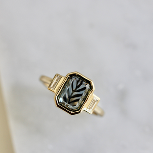 Our hearts are bursting over how perfect this nature-inspired ring came out! Featuring a stunning 2.23 carat teal portrait cut sapphire with eye catching swirling sky-like colors and flanked by high quality white baguette cut diamonds. This extra-special stone deserves an extra-special detail - so we did a one-of-a-kind leafy gold cut out for the ultimate nature lover. Bezels galore, rich 14k yellow gold, and a little lift to accommodate a stacking band finish off this unique ring.