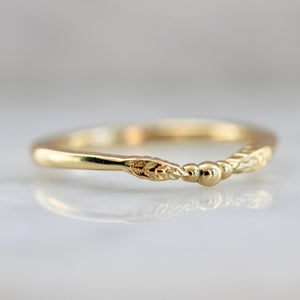 This delectable stacking ring features wheat sculptural elements and three orbs that represent 'past, present, and future' in 18k Yellow Gold, as well as a slight curve to fit most unique profile engagement rings but subtle enough to be worn by itself. She sits low profile and flush to the finger. There is only one.