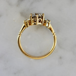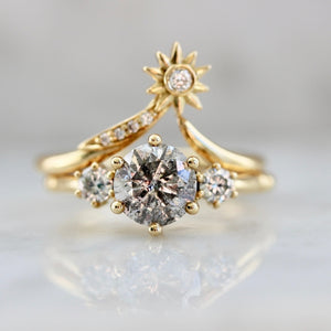 Designer Jenny Norman elegantly includes fine details and symbolism in her work. Dolce is no exception. Rich 18k Yellow Gold make up this antique inspired design with a modern, alternative twist. Delicate notches on the shoulders rise to meet a pair of bright white round brilliant cut diamonds, and in the center sits a cosmic salt & pepper round brilliant cut diamond, all held together with petite button prongs. This ring sits low profile and flush to the finger.