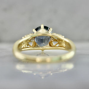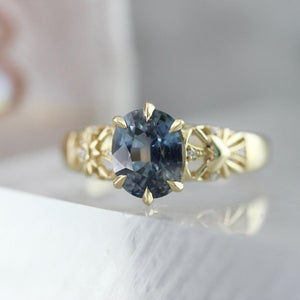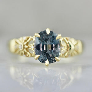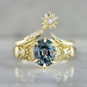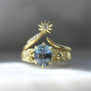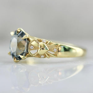Balancing symbols of light and love, this ring serves as a reminder that there is magic all around us. At the center of the design is a glittering 2.46 carat unheated oval sapphire sourced from artisanal female miners from the Umba Valley, Tanzania. The stone’s natural properties give it a magical effect, as it dramatically changes color from a stunning light blue color in daylight and rich purple hue by moonlight. The ring is accented by high quality diamonds and unique heart and sun engraving in the shoulders and is crafted in 18k Yellow Gold.