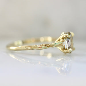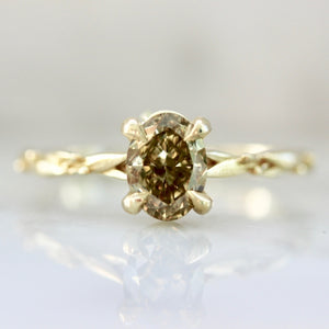 This ring symbolizing deep rooted love, peace, and full-hearted acceptance of both self and others. At the center sits a high quality, 1.25 carat natural olive green oval cut diamond, with a setting of 18k Yellow Gold that features two golden olive branches that delicately intertwine. A perfect choice for those who want a romantic twist to the traditional solitaire.