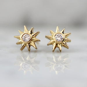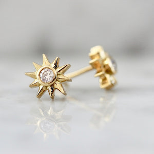 When you wish upon a star...designer Jenny Normal comes through! These diamond studs for the perfect gift featuring .12 carats total white brilliant cut diamond studs that are nestled in the heart of 18k Yellow Gold bezel stars.