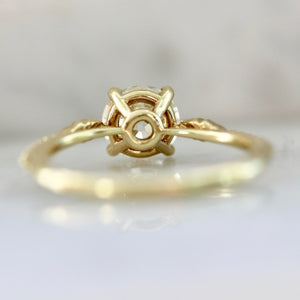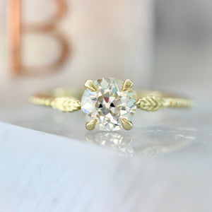 A sizable 1.25 carat Old European cut diamond has the limelight in this unique solitaire engagement ring. Warmth and hopefulness exude from this O/P colored droplet of pure sunshine that sits in a hand carved, delicate nature inspired 18k Yellow Gold setting. She sits low profile and flush to the finger.