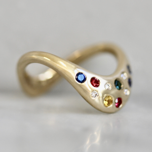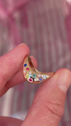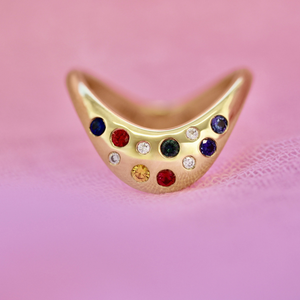 Zaha is queen of the curve! This ultimate statement ring is perfect on any finger and features a sprinkling of rainbow round cut sapphires mixed with a smattering of white round cut diamonds. The gemstone really pop against the 14k gold setting that lovingly tapers for the ultimate comfort fit and visual appeal.