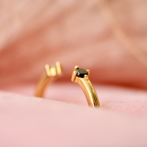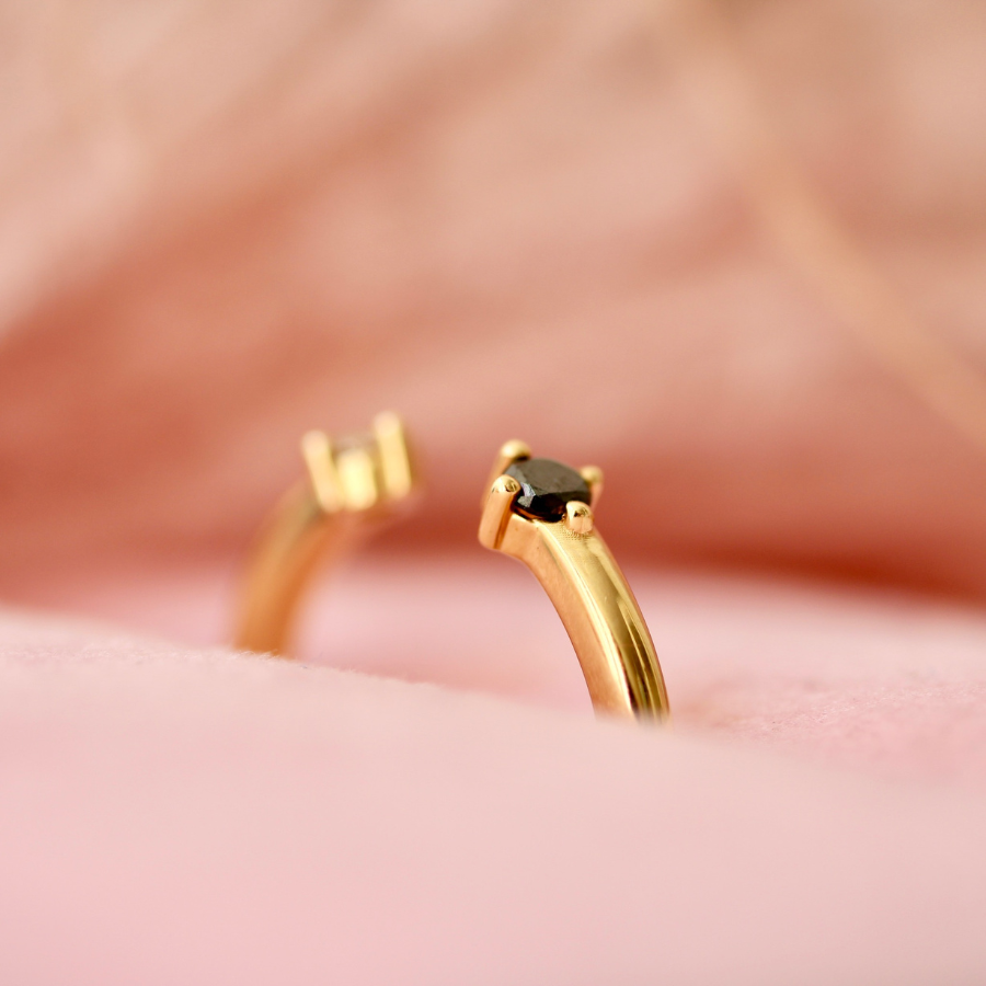 This cuff band is the perfect accompaniment to any outfit. Snuggle it up to a stackable ring, rock the gap of your low profile piece, or embrace the drama of wearing it solo! Featuring one white and one black round brilliant cut diamonds at either end, held in compass set prongs and crafted in 14k Yellow Gold. Dottie would be the perfect gift for those who want a multitude of choices.
