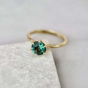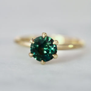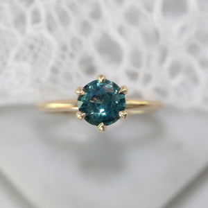 This Stella features a 1.40 carat round brilliant cut sapphire that has the perfect mix of blue and green tones to create the most delicious, almost bi-color, teal hue. Perfectly saturated without feeling dark and the sparkle is like none other! Placed in our signature minimalist solitaire setting that is made to maximize each stones sparkle, and finished with a combination of six petite claw prongs, basket detail, and 14k yellow gold.
