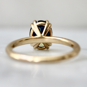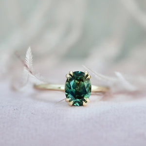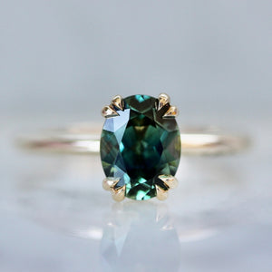 Beauty in simplicity! The drop dead gorgeous solitaire features a 1.92 carat oval cut sapphire that is predominately green with flashes of teal that is reminiscent of peacock coloring. Rich 14k yellow gold high polish stackable setting and eye catching double claw prongs that secure the center stone celebrate the overall presentation of this ring.