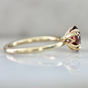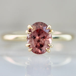 This dusky and romantic 2.44 carat oval cut zircon has the most delicious warm pink hue! The carat size ensures generous finger coverage and we added a fun basket detail and double baby claw prongs to really set this solitaire apart. Finished in silky 14k yellow gold and elevated just enough to allow for your favorite stacking band.