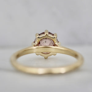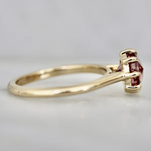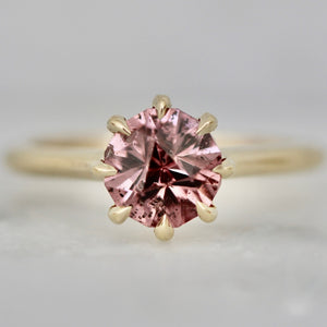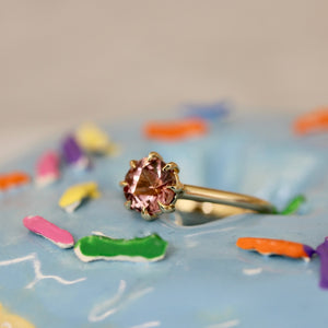 This ring showcases a captivating 1.95 carat raspberry pink garnet that exudes beauty from every angle with a unique round cut. With its deep saturation and flawless sparkle, this gem is nothing short of mesmerizing. Set in 14k yellow gold, it features a delicate eight prong baby claw setting that forms a charming basket, enhancing its visual appeal. It's finished with a stackable setting allowing you to pair it effortlessly with your favorite band to create your own unique look.