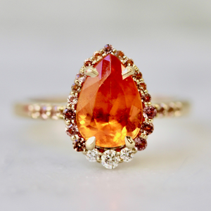 All the warmth of golden hour is captured in this ring! A 2.48 carat pear cut spessartite garnet sits at the center, glowing with vibrant orange fire accented with a sun-kissed ombré of peach sapphires and white diamond accents around the center stone. Crafted in 14k yellow gold, this ring strikes the perfect balance between bold and wearable. Made to shine solo or stack with ease.