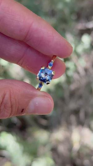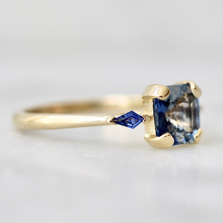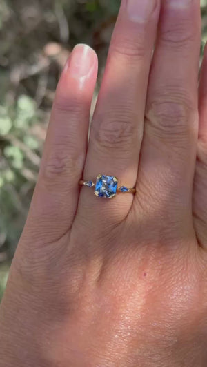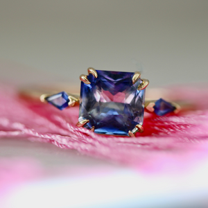 This extravagant take on a classic three stone design features a 1.58 carat blue-white radiant cut bi color sapphire and lovingly offset by a pair of stunningly rich blue kite cut sapphires. Set in 14k yellow gold and held by double claw prongs. You don't get closer to the perfection than this.