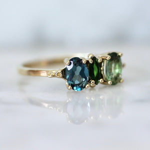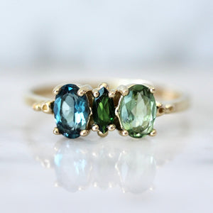 Portia features a striking palette of vibrant teal and greens and paired with a unique trilogy design that packs a colorful punch. Made entirely of juicy tourmalines, the mixed cuts of marquise and ovals makes it feel fresh and fun. Set in 14k yellow and low to the finger for ultimate comfort and style. Perfect as a treat yourself ring to accentuate any outfit or occasion.