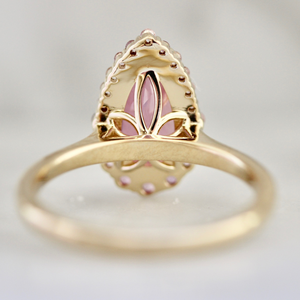 If you’re searching for a ring that feels like it was made just for you, Princessa might already be calling your name. At the center is a 2.55 carat pear cut pink sapphire with an opalescent glow that feels soft, romantic, and quietly powerful all at once. The way the blush, rose, and lilac tones drift through the stone means it never looks the same twice. It’s the kind of gem you catch yourself staring at throughout the day. A graduated halo of blush toned sapphires wraps the center adding depth and sparkle without overwhelming the main event. Hidden gold petals add the perfect amount of stability to the halo as well as the cutest detail to really bring the design together. Finished in 14k yellow gold, this ring is ideal for those seeking a unique and eye-catching design for an engagement or statement ring. It has been slightly elevated to accommodate your favorite stacking band.