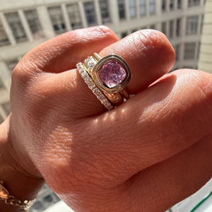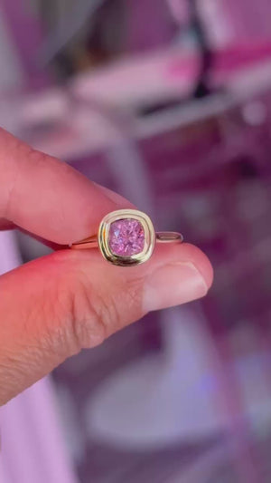 This ring is so effortlessly chic. At the center is a 1.33 carat square cushion cut spinel with the purest bubblegum pink hue and a high crown that absolutely glows. Framed in a bezeled metal halo that makes it super sleek and shows off this delicious spinel. Finished in 14k yellow gold and slightly elevated to allow your favorite stacking band.