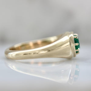 Sour Apple is so fun and all curves. This chunky .77 carat heart cut emerald just begged to be put in a statement ring and the Gem Breakfast kitchen did not disappoint. 14k yellow gold surrounds this stunning stone in a funky fresh bombe dome held with prongs that tapers towards the back. We went above and beyond with the details and added a fun heart-shaped cutout in the back - love it from all angles! This low profile ring would look sexy on any finger, and we guarantee you will never want to take it off.