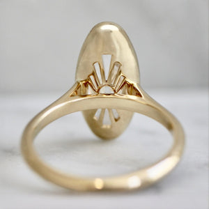 Cookie Monster is a maximalists dream and for those who are in want of a moval ring as delicious as dessert. A 2.55 carat lab moval diamond is set in the center and encircled with a slim bezel. We know you're already in love, but take a peek at the back and you'll see the sexiest little detail - a custom gold basket cut outs radiating from the center. This allows maximum light for maximum sparkle. You will never find another moval ring like this! She's crafted in 14k yellow gold, comes stackable and is ready to pair with your favorite bands.