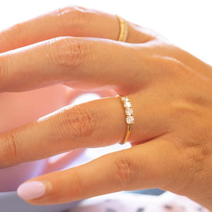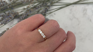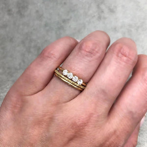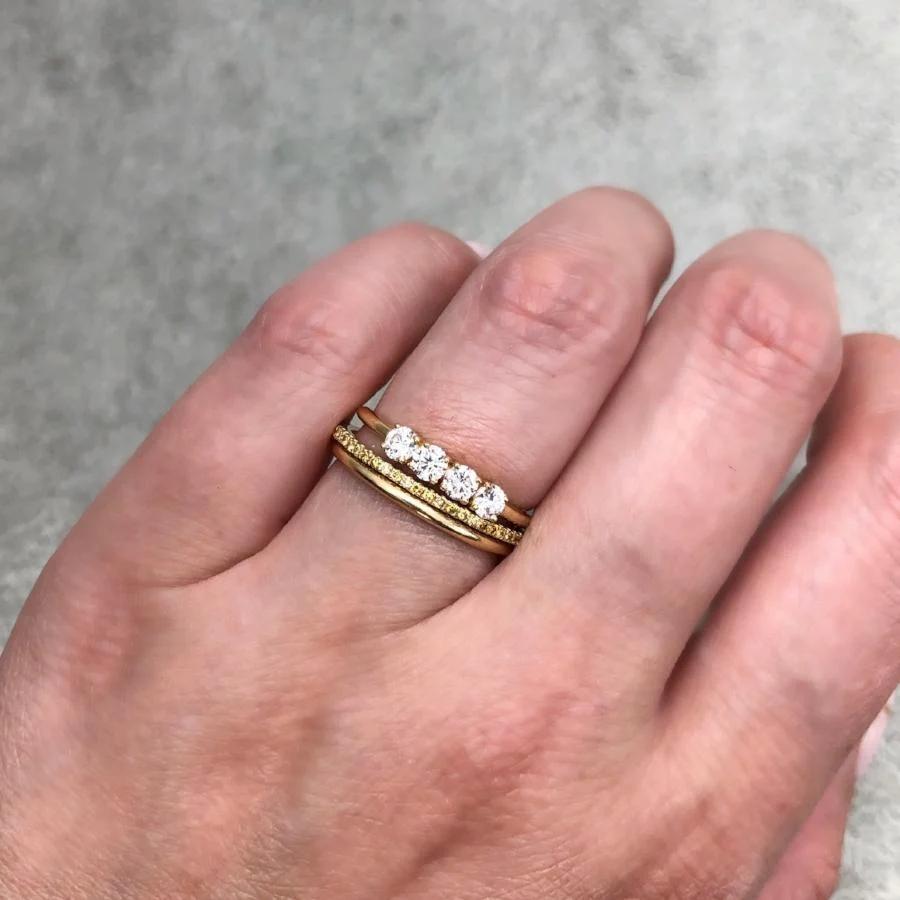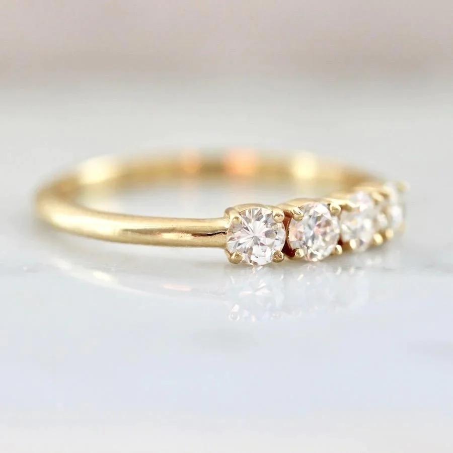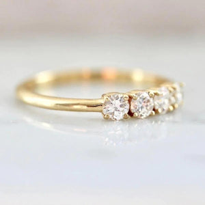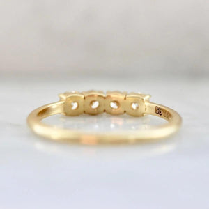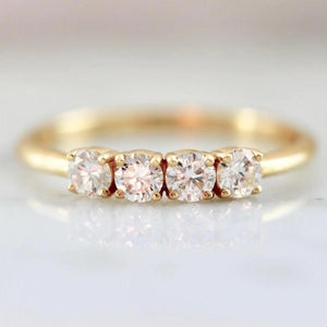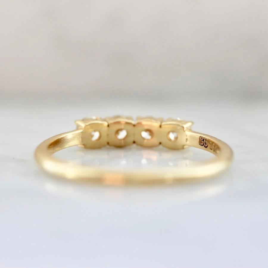 Start your love story with this four stone diamond band made with savory white round cut diamonds and set in 18k yellow gold. Appetizing sparkle on your finger that will always have you looking down to admire it.