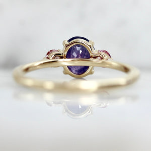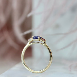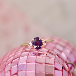 Crowd Pleaser is sure to be a Gem Breakfast fan favorite! At the center sits a 1.16 carat medium oval cut opalescent sapphire that looks positively effervescent. On either side sit a pair of vibrant pink round brilliant cut sapphires that just add to the uniqueness of this ring. topped with a serving of 14k Yellow Gold and held by stunning claw prongs, you don't get closer to the perfection than this.