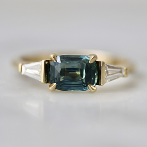 This ring showcases a dreamy 1.53 carat cushion cut sapphire awash in ethereal ocean hues, set in a modern east-west orientation for maximum finger coverage. Sleek tapered baguette diamonds flank the center stone, adding just the right touch of sparkle and symmetry. Finished with delicate claw prongs in warm 14k yellow gold, this beauty is as stackable as it is unforgettable.