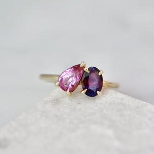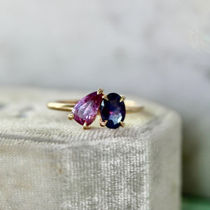 It takes two to tango and we are dancing our hearts out with how stunning this ring is. This modern take on the moi et toi ring features a 1.08 carat bubblegum pink pear cut sapphire that is slightly elongated and nestled alongside an equally stunning .92 carat deep purple oval cut sapphire. Finished in 14k yellow gold and claw prongs, you don't get closer to the perfection than this. This ring sits low and flush to the finger.