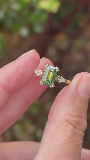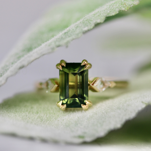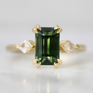 Starlet holds a dynamic 2.67 carat emerald cut green sapphire that showcases perfect deep forest and mossy green hues. It's paired with a set of white kite cut sapphires on either side to give the perfect amount of finger coverage. This ring is finished with chic double claw prongs, 14k yellow gold, as well as a subtle elevation that allows for stacking your favorite bands.