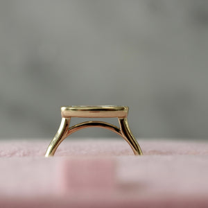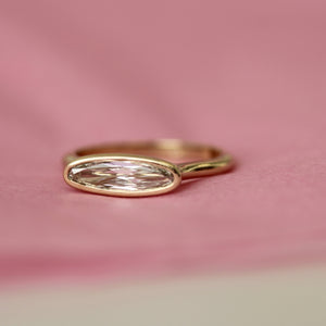 You don't get much more delicious than Cookie Butter! A silky smooth .60 carat white moval cut lab diamond is encapsulated in an extra slim bezel of 14k yellow gold to really capture how sleek this moval diamond ring is. She comes stackable and is ready to serve as the the ultimate self care treat.