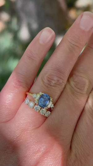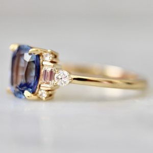 This ring features a mesmerizing 2.05 carat elongated cushion cut sapphire - its hue a rich, velvety twilight that shifts with every movement. Framing the center stone: a symphony of white baguette and round brilliant diamonds totaling 0.38 carats, adding just the right amount of sparkle without stealing the show. Crafted in 18k yellow gold with a low profile for maximum comfort and wearability.