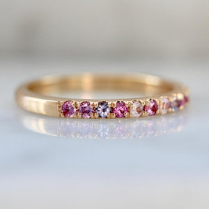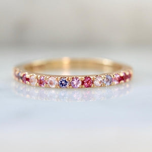 Spoil your dinner with this sweet treat! This delicious mix of sapphire, tanzanite, and tourmaline make our hearts flutter. Lined up in an eclectic fashion, this collection of stones could not be anymore appealing to the eye. Set in u-shaped prongs and 18k Peach Gold, this band is ready to serve as the the ultimate self care treat. Limited Edition, there is only one.