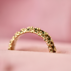 Dive into deep, serene color. Orez is set with 1.00 carat total of lush teal round cut sapphires, each stone a tiny tide pool of blues and greens. The organic, clustered setting flows into a tapered 14k yellow gold band for a look that’s as comfortable as it is striking. Wear it solo for a flash of color or stack it for your own ocean-inspired ring party.