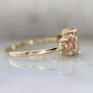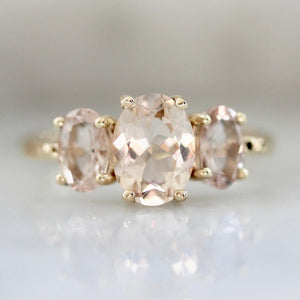 An ethereal and dreamy sight, there is nothing more romantic than this three stone oval cut trilogy ring. Each morganite is a beautiful hue of peach with delightful flashes of pink. Placed in a simple setting of 14k Yellow Gold, this ring is the perfect treat.
