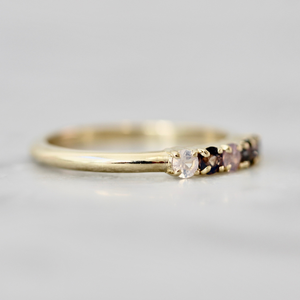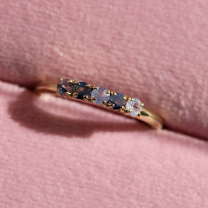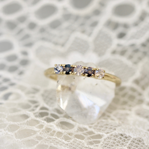This dreamy little number serves up a perfect flight of sapphires - from inky midnight to soft lavender and airy sky blue, all set in buttery 14k yellow gold. Each sapphire is prong set to sparkle from every angle, and if you peek underneath, you’ll spot the sweetest secret: tiny heart cut-outs hiding behind every stone. A stackable treat with a secret: part rainbow, part love note. We’d give it five stars, but honestly? It’s more of a five hearts kind of ring.