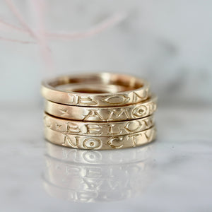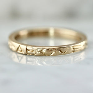 As Above So Below - the alchemical riddle describing the interconnectedness of the spiritual and the physical realms! This magical inscription was hand carved into wax and cast into solid 14k yellow gold creating this unique band with a soft matte brushed finish. Sitting at 2.00 mm wide, it feels neither too wide not too thin and ultra comfortable to add to your existing stack or worn alone. Wear it as a symbol of your journey toward balance, harmony, and cosmic connection.