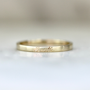 Who is your bae? This band is a blank canvas and perfect for anyone who would love a daily, tangible object to show their affections. A partners name, a date of importance, words of affirmations, or just a sweet ode to something or someone you love. Swift and careful hand movements create engraved texture with precise detail in your choice of golds. All hand engraved locally in San Francisco, CA.