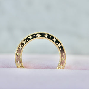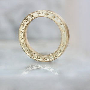 Indulge in this chunky gold band! From the top you see 3.00 mm of high polish gold and milgrain detail along the edges, but as you move it on your finger the secret of celestial hand engraved stars that adorns the profile catches your eye! A super fun band for the star lover. Limited edition, there is only one.