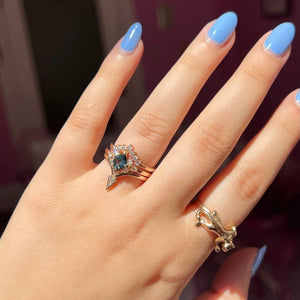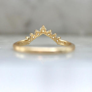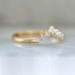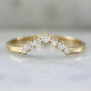This delicate tiara band makes a wonderful addition to your stack or on its own. Seven high quality white round brilliant cut diamonds are set into your choice of golds, and is perfect to pair with low profile rings.