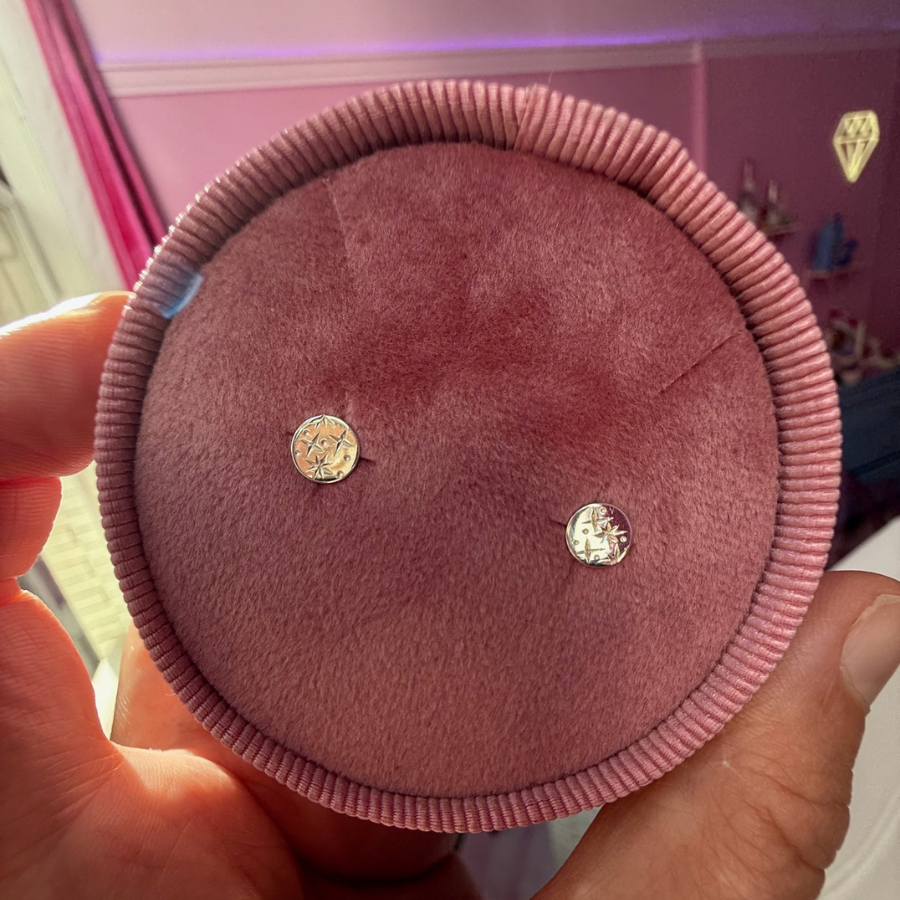 These dainty celestial discs are perfect for everyday wear, featuring hand engraved star and cosmic detailing. Crafted in luminous sterling silver and available for a limited time this holiday season. The perfect treat yourself moment or a gift for your favorite stargazer. Available in two sizes.