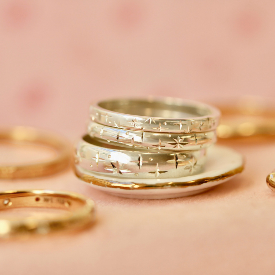This Mid-Century inspired ring is the widest in our Celeste trio which features star engravings and a rounded gold band. Swift and careful hand movements create this motif with precise detail and extraordinary design in luminous sterling silver. Available for a limited holiday release!