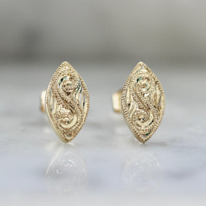 Not your average studs! These delectable 14k Yellow Gold bar studs feature a hand engraved swirl motif and milgrain border, and are the perfect treat yourself gift! Limited, there is only one.