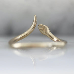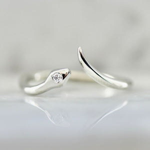 This open cuff snake ring is the epitome of cool girl chic as well as a stunning self care treat! This snake ring is perfect to rock solo or snuggle a snake in a stackable ring set. The smooth curves of the snake ring are crafted in 14k yellow gold and hold a glimmering white round brilliant cut diamond in the snake head.