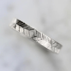 A modern take on a classic art deco gold band design. Swift and careful hand movements create this wheat arrow engraved texture with precise detail and extraordinary design in your choice of golds. All gold bands are hand engraved locally in San Francisco, CA.